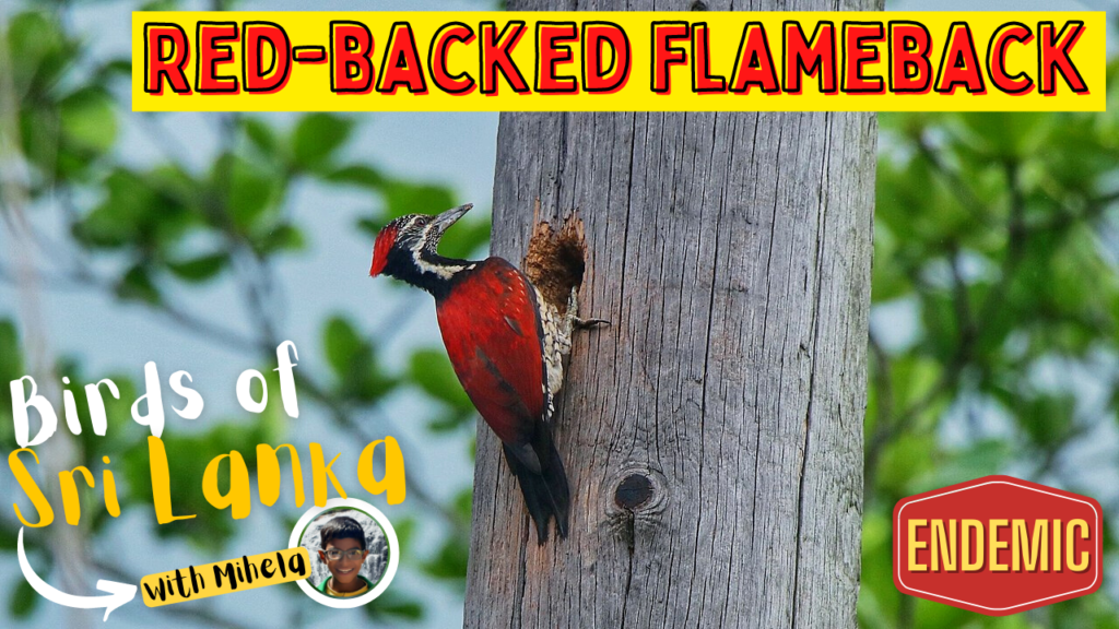 The Red-backed flameback, Lesser Sri Lanka flameback, Sri Lanka red-backed woodpecker or Ceylon red-backed woodpecker is a species of bird in the family Picidae (Dinopium psarodes). It is endemic to Sri Lanka, only absent in the far-north. Separated from all other flamebacks except Black-rumped by dark throat, lack of a contrasting black horizontal stripe below the cheek, and its distinctive call. Male has a complete red cap while the female has a black and white spotted forehead. Known as Pita Rang Karelle locally, Associated with home gardens, plantations, and most wooded habitats except for dense tropical forest.